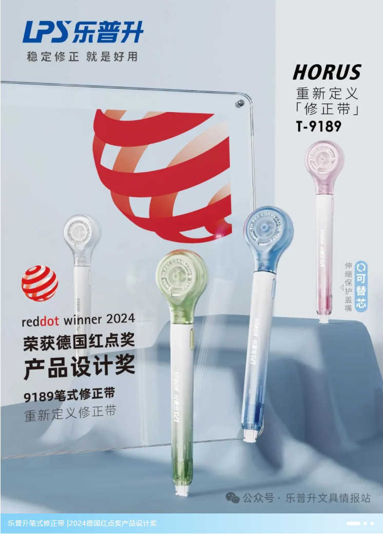 其中T-9189笔式修正带凭借其创新的笔式设计和人性化的使用体验,成功斩获2024年德国红点产品设计奖。这款产品采用颠覆性笔式外观,创新单芯轮结构与推拉式保护嘴,解决了传统修正带的使用痛点,让修正也能如书写般顺滑,为文具设计提供了新的思考方向。
